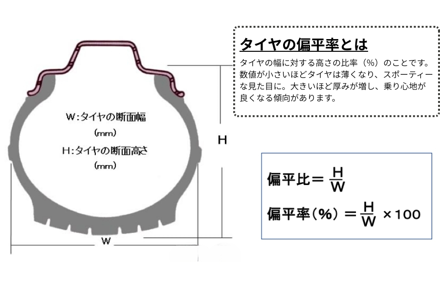 - 65 = 偏平率(単位:%、※計算式=サイド部の高さ ÷ タイヤ幅 ×100)