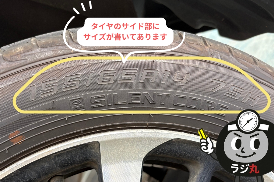 タイヤの側面には「155/65R14 75H」といった数字と英語と記号が刻まれています。この組み合わせがタイヤサイズになります。