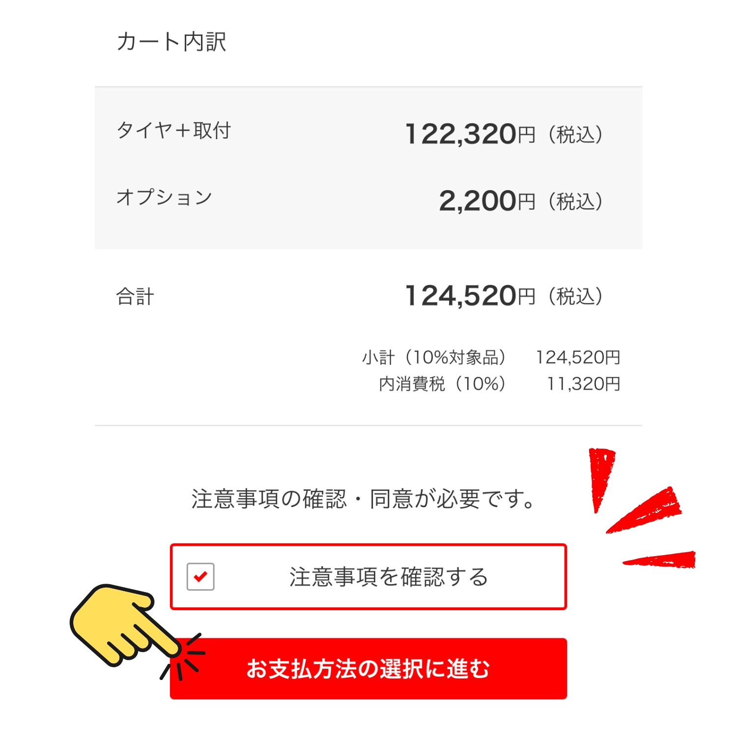 タイヤを交換する店舗と日程が決まったら、カート画面に移り内容を確認して「支払い方法の選択」に進みます。