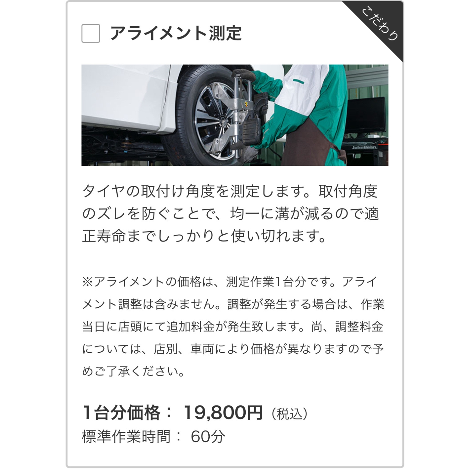- タイヤの取付け角度を測定。取付け角度のズレを調整する場合は、店頭で追加料金が発生します。
