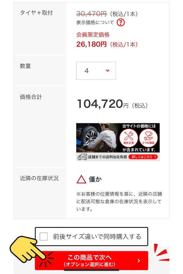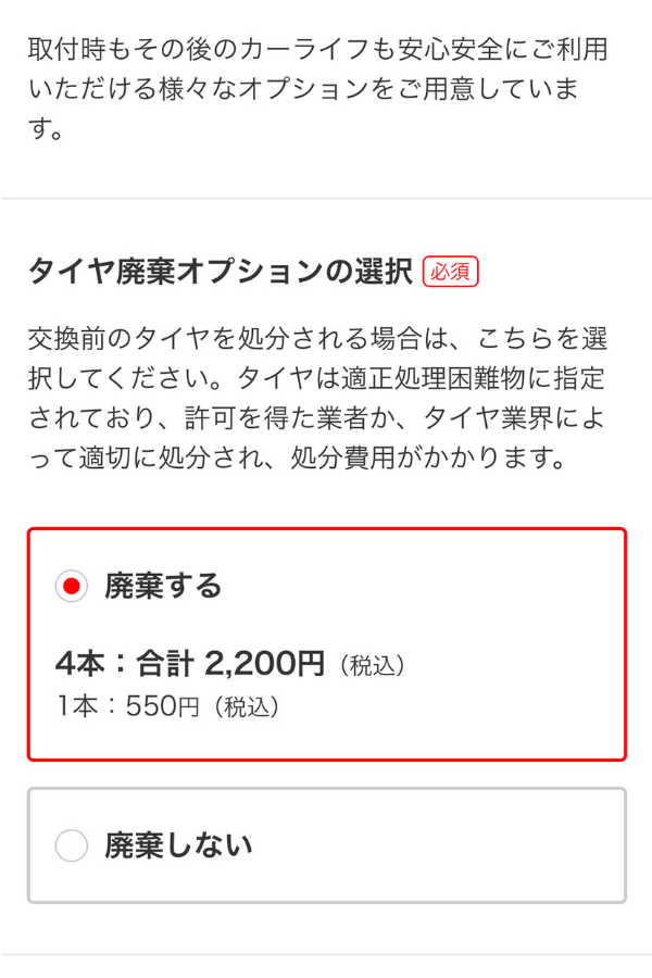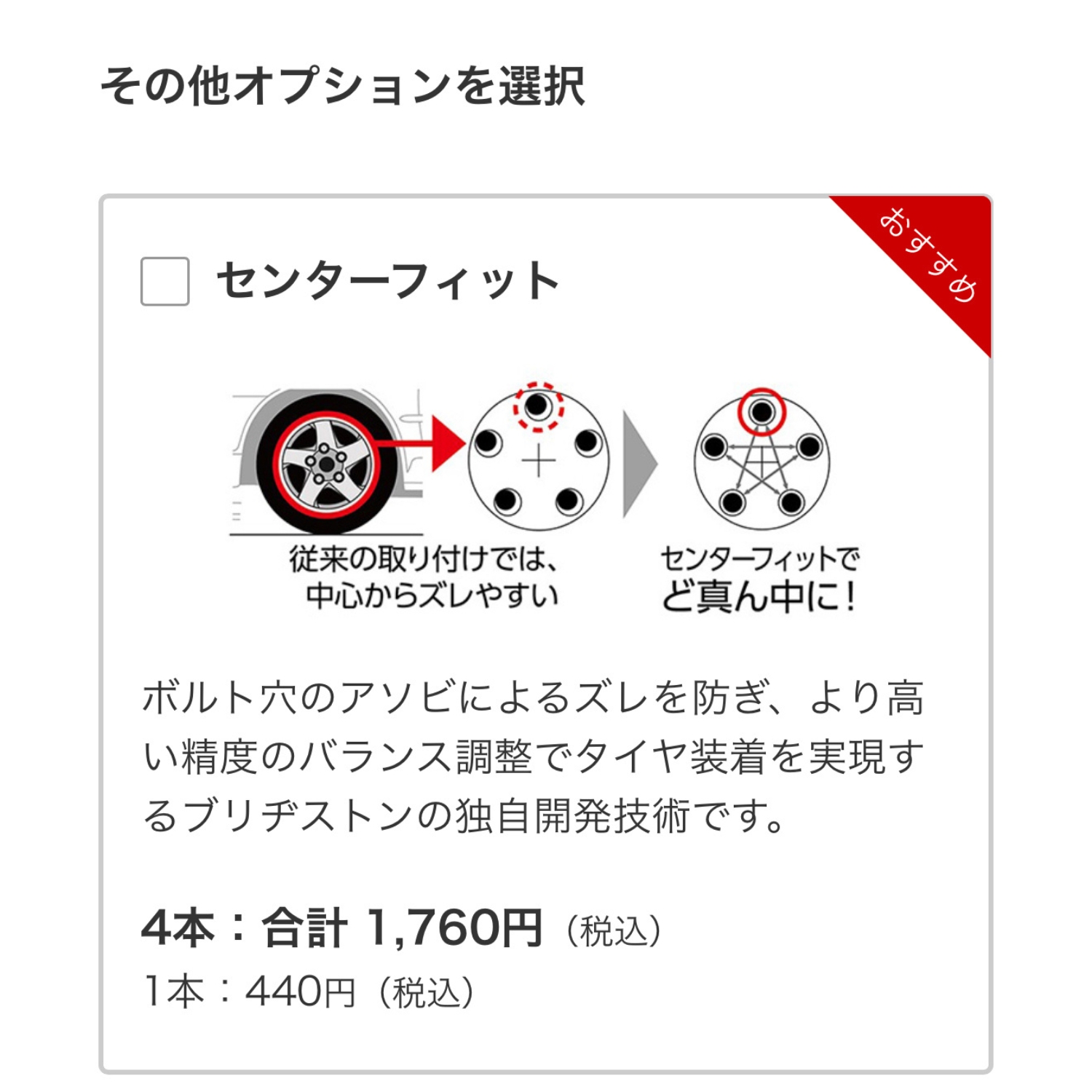 タイヤを選ぶと4本交換の見積もり金額が提示されます。金額が問題なければ、オプション選択へ移ります。