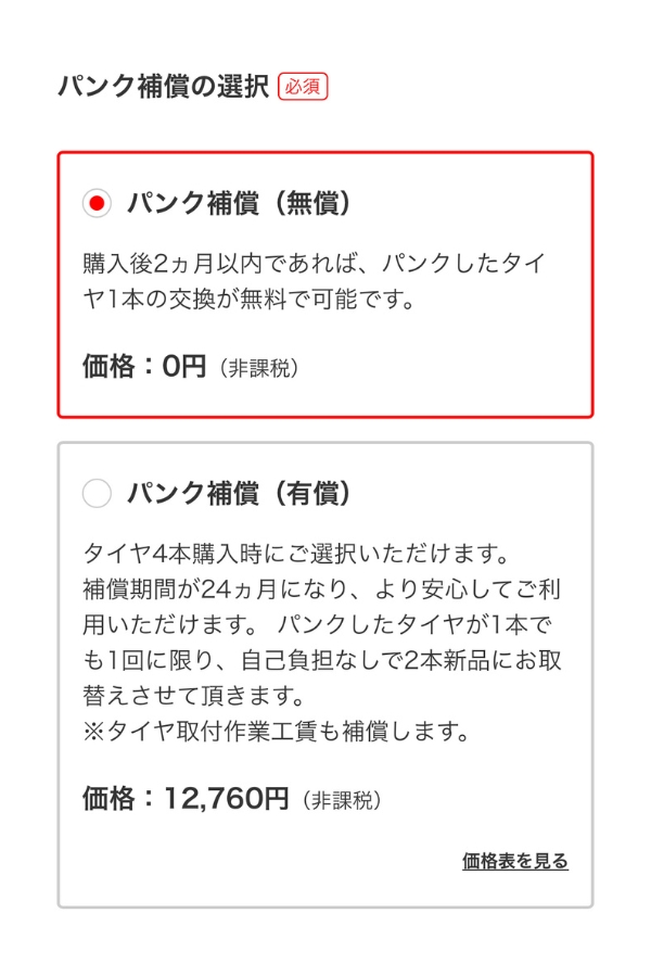 有償サービス:保証期間は24ヶ月、パンクしたタイヤが1本でも1回限り、自己負担なしで2本新品に取り替えできるサービスです。(タイヤ交換工賃も保証)