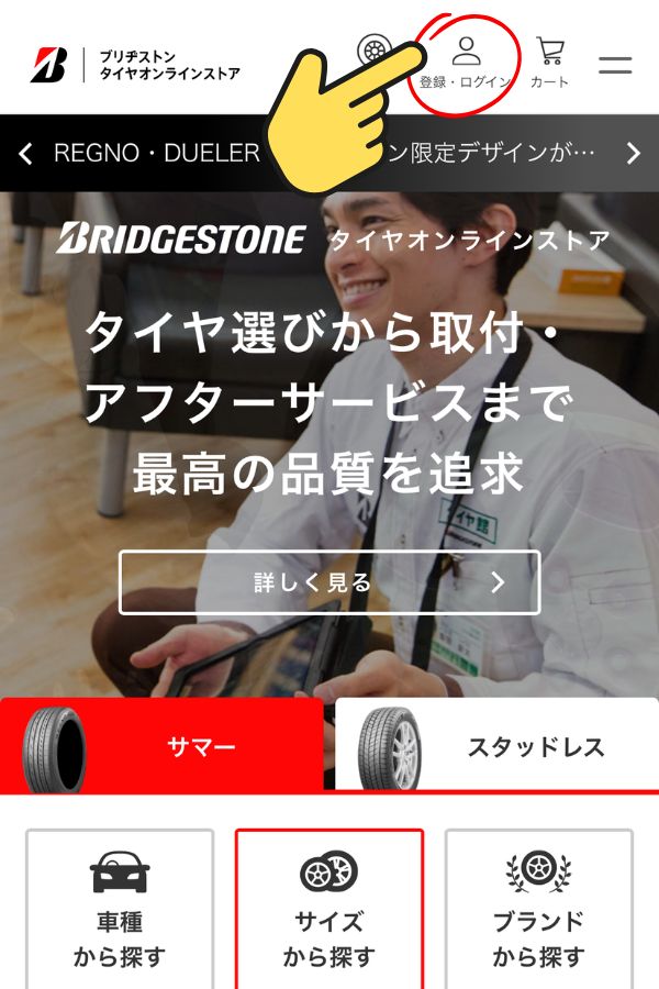 Step1|ブリヂストンオンラインストアのTOP画面から「登録・ログイン」をタップ