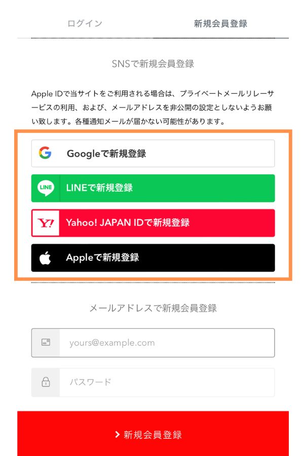 新規会員登録は、①既存のSNSアカウントを使ったカンタン登録、②メールアドレスを使った登録の2種類より選択できます。