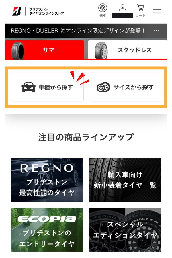 ブリヂストンオンラインストアにアクセスしたら、車種やタイヤサイズを入力します。「車種から探す」「タイヤサイズから探す」といった検索機能があるため、初心者でも迷わず進められます。