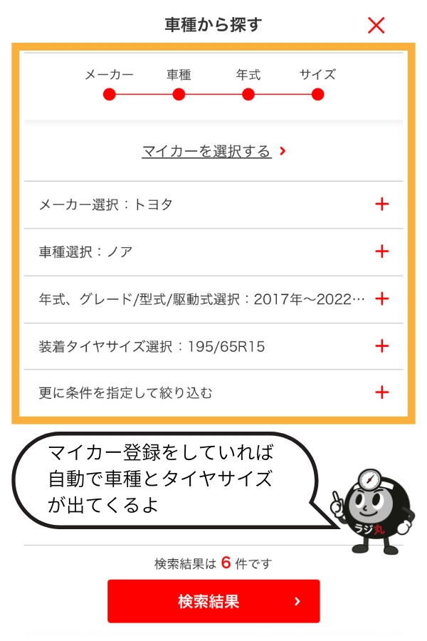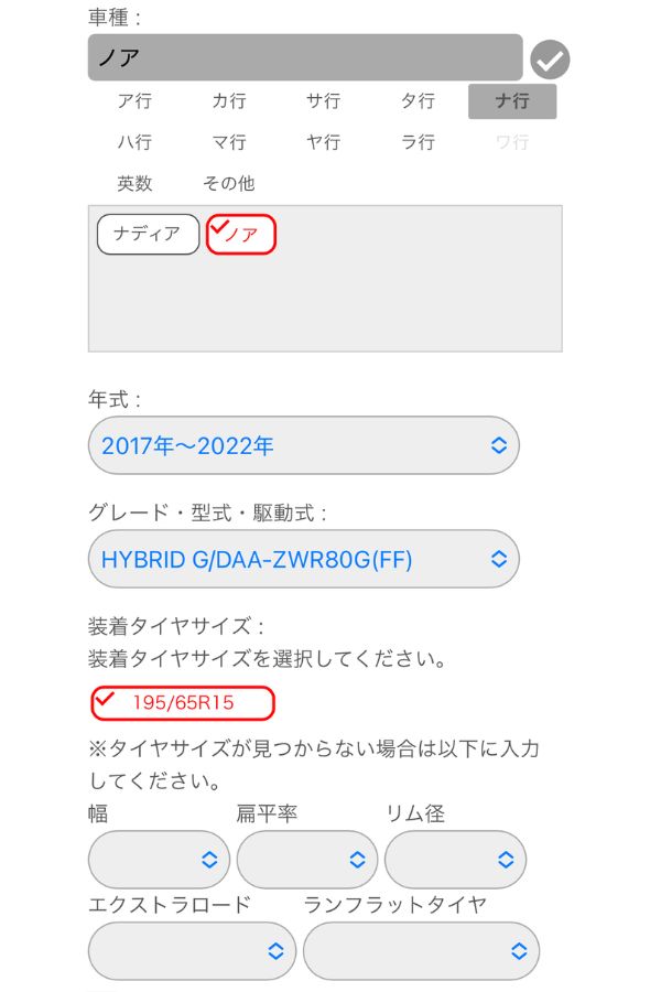 車両の年式、型式(※1)を選択して、「タイヤサイズ(※2)」を選びます。