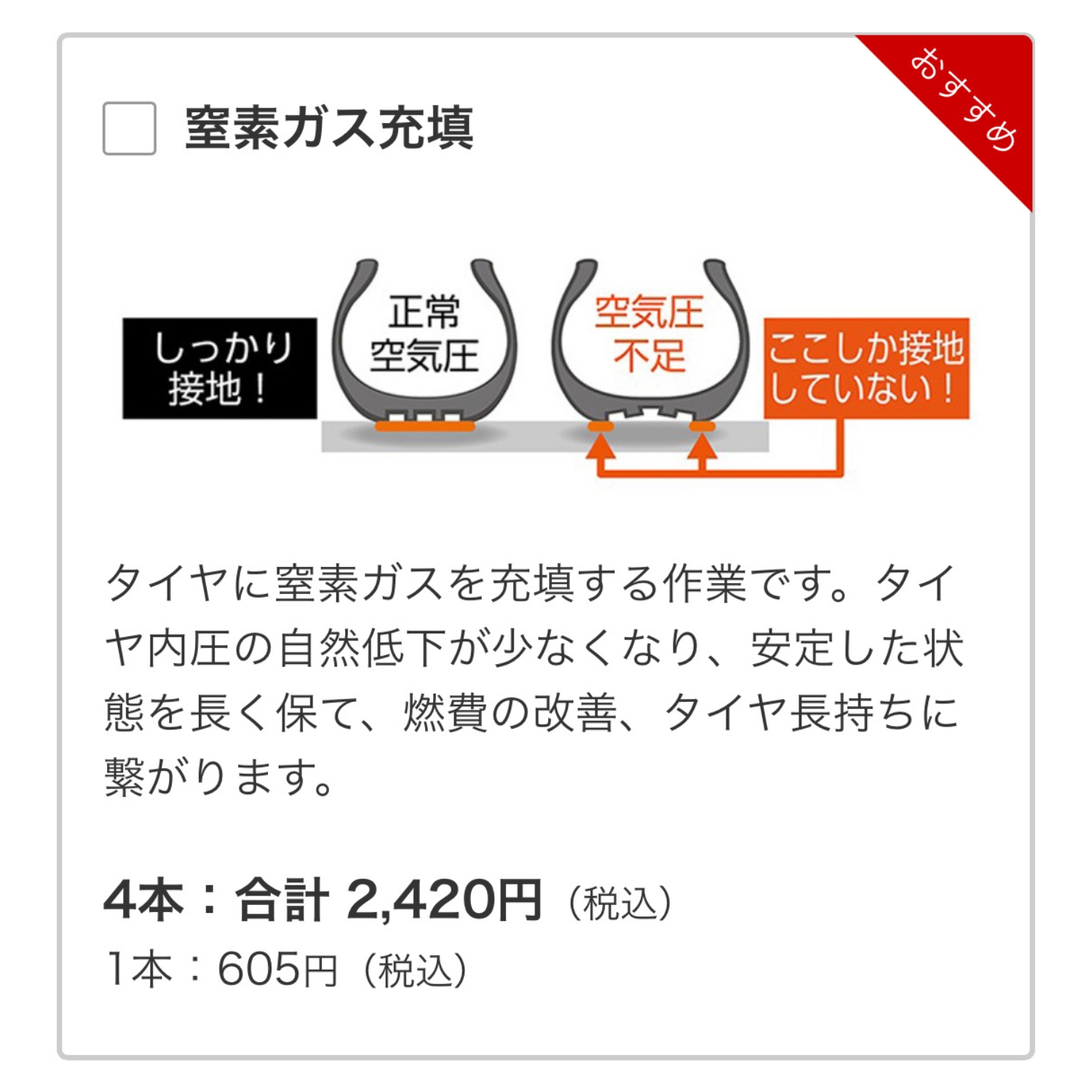 - タイヤに窒素ガスを充填するサービス。タイヤの内圧が自然低下が少なくなり、安定した接地面を持続します。