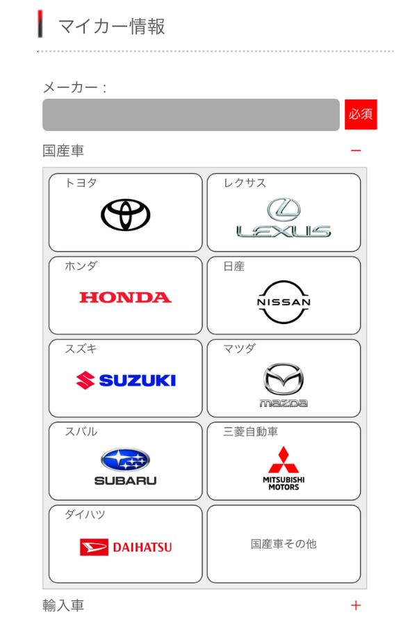 新規会員登録の最初はマイカー登録になります。車両メーカーを選択してください。