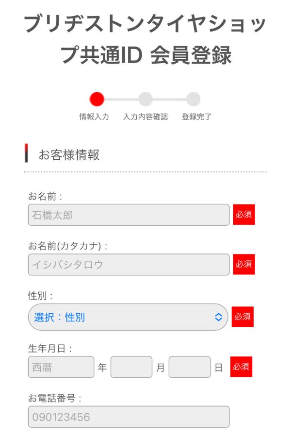 初めてブリヂストンオンラインを利用する方は、ブリヂストンタイヤショップの共通IDを新規登録します。この、共通IDの情報を正確に入力しておくことで、ショップに情報共有されて今後の手続きが”ラク”になります。