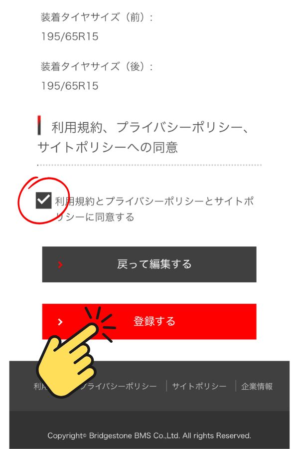 マイカー情報、個人情報の間違えを確認してください。「利用規約とポリシー同意」にチェックして登録ボタンをタップすれば、登録完了です。