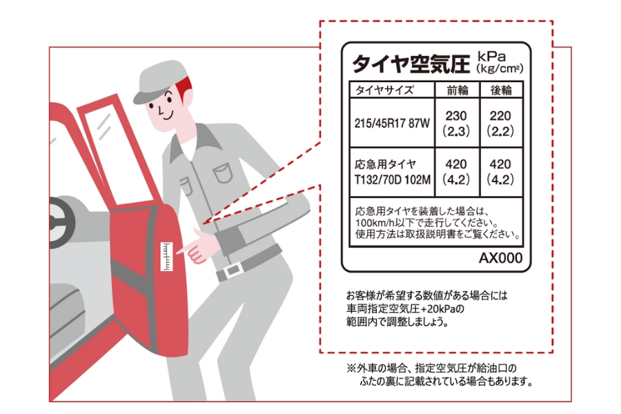 タイヤ側面が読み取りにくい場合は、運転席ドアを開けた付近に貼られている「タイヤ空気圧ラベル」でも確認できます。ここにはメーカー推奨のタイヤサイズと空気圧が記載されているので、純正サイズを確認したいときに便利です。