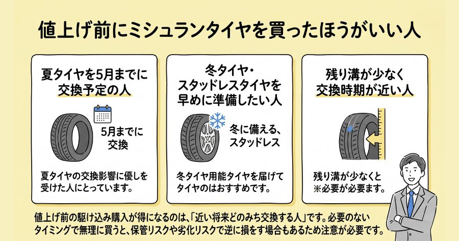 値上げ前の駆け込み購入が得になるのは、「近い将来どのみち交換する人」です。必要のないタイミングで無理に買うと、保管リスクや劣化リスクで逆に損をする場合もあるため注意が必要です。
