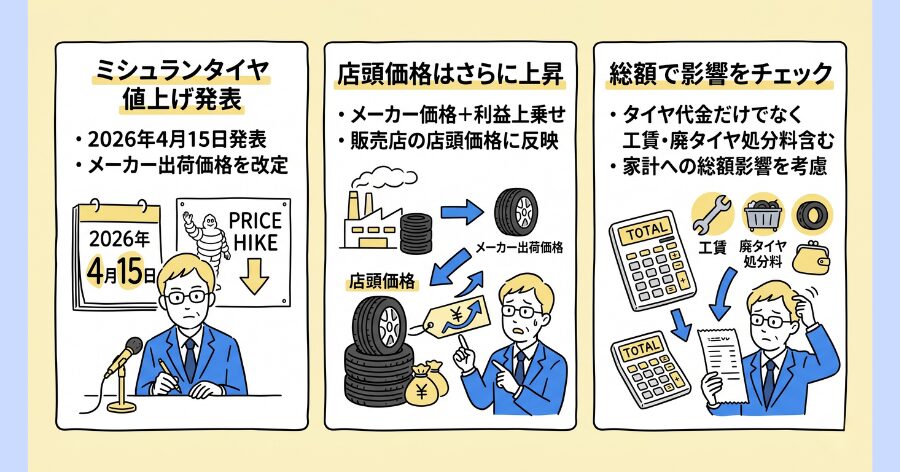今回改定されるのは、あくまでメーカー出荷価格です。つまり販売店での店頭価格はさらに利益が上乗せされた形で反映されるため、工賃や廃タイヤ処分料を含めた総額で家計への影響を見ておく必要があります。