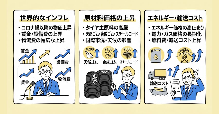 コロナ禍以降の物価上昇は、タイヤ業界にも重くのしかかっています。賃金・設備費・物流費が幅広く上昇しており、製品価格への転嫁が避けられない局面を迎えました。