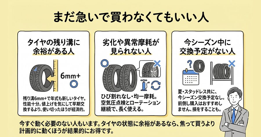 逆に、今すぐ動く必要のない人もいます。タイヤの状態に余裕があるなら、焦って買うより計画的に動くほうが結果的にお得です。