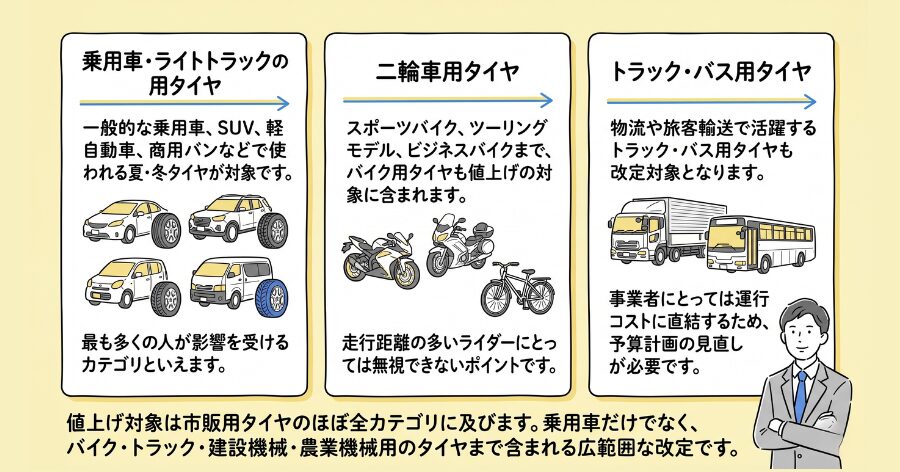 一般的な乗用車、SUV、軽自動車、商用バンなどで使われる夏・冬タイヤが対象です。最も多くの人が影響を受けるカテゴリといえます。