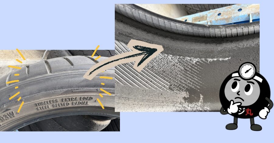 パンク修理等の前に、タイヤの外面や内面に黒い擦れ跡、シワ、変色などの「引きずり痕」がないかを必ず確認します。これらの痕跡があるタイヤは再使用禁止です。