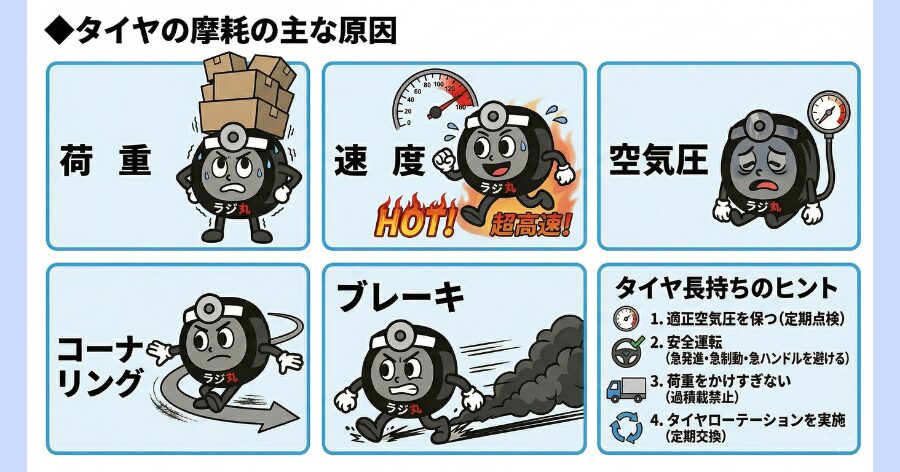 荷重が大きくなるほど、タイヤのたわみが増して摩耗が促進。路面にはたらく駆動力も大きくなるために摩耗が進みます。