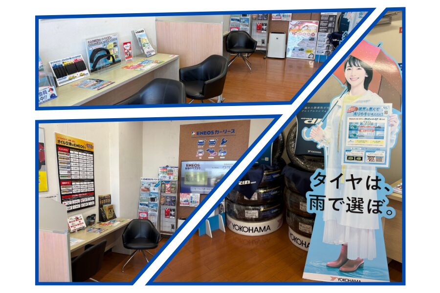 待合室は綺麗に整頓されており、ENEOSの各種サービス(カーリース、オイル交換、キーパーコーティングなど)の案内が充実していました。Wi-Fi環境等は店舗によりますが、清潔感があり女性でも待ちやすい雰囲気です。