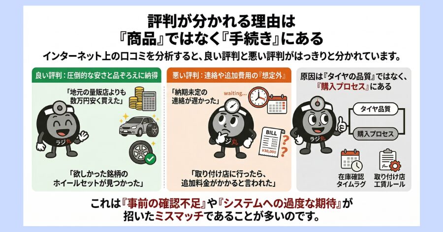 インターネット上の口コミを分析すると、良い評判と悪い評判がはっきりと分かれています。しかし、よく見るとその原因は「タイヤの品質」ではなく、「購入プロセス」にあることがわかります。