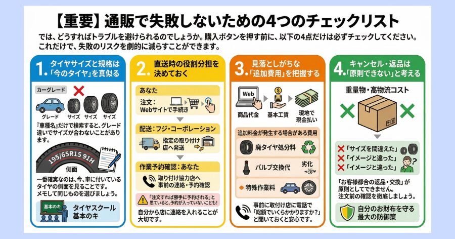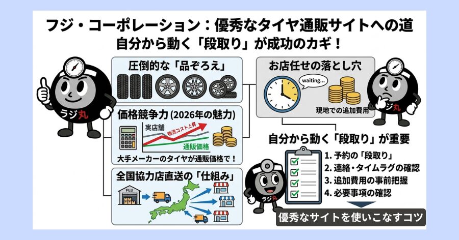 結論からお伝えすると、フジ・コーポレーションは「段取り」さえ守れば、非常に優秀なタイヤ通販サイトになります。評判が分かれる原因の多くは、商品そのものではなく、注文から取り付けまでの「手続き」の誤解にあるからです。